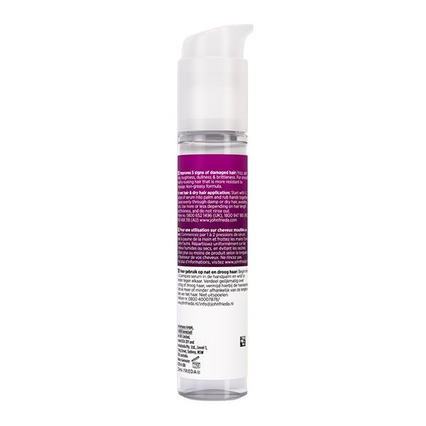 Serul John Frieda Frizz Ease The Rescuer Weightless Repair ajută la repararea părului deteriorat și la reducerea frizz-ului, oferind un aspect neted și strălucitor. Formula ușoară cu BondForce Complex și proteină de lupin contribuie la refacerea structurii firului de păr și la întărirea acestuia, reducând semnele vizibile de deteriorare precum vârfurile despicate, aspectul tern sau fragilitatea. Serul creează o barieră protectoare împotriva umidității și oferă protecție termică până la 230°C, lăsând părul mai rezistent, neted și ușor de coafat, fără a încărca sau a lăsa reziduuri.