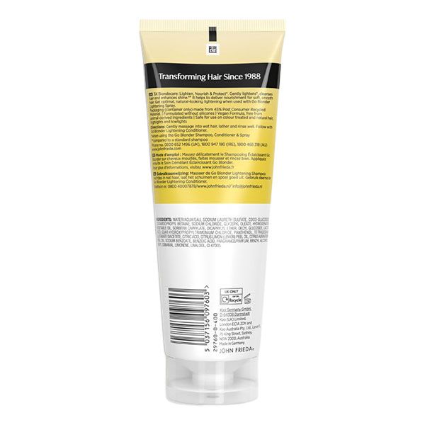 John Frieda Go Blonder este un șampon iluminator conceput special pentru îngrijirea părului blond, fie acesta natural sau tratat chimic. Formula sa delicată curăță eficient scalpul și firele de păr, contribuind la deschiderea treptată a nuanței pentru un aspect radiant și luminos, asemănător celui obținut prin expunerea la soare. Produsul include un complex botanic de citrice care ajută la fortificarea structurii capilare, reducând semnificativ riscul de rupere. Șamponul este vegan, nu conține silicon și este formulat cu ingrediente de origine naturală în proporție de 95%. Utilizarea regulată permite obținerea unei nuanțe mai deschise, oferind în același timp o senzație de prospețime datorită notelor revitalizante de citrice.