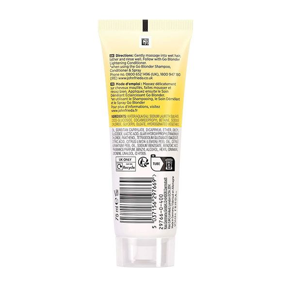 John Frieda Go Blonder este un șampon iluminator conceput special pentru îngrijirea părului blond, fie acesta natural sau tratat chimic. Formula sa delicată curăță eficient scalpul și firele de păr, contribuind la deschiderea treptată a nuanței pentru un aspect radiant și luminos, asemănător celui obținut prin expunerea la soare. Produsul include un complex botanic de citrice care ajută la fortificarea structurii capilare, reducând semnificativ riscul de rupere. Șamponul este vegan, nu conține silicon și este formulat cu ingrediente de origine naturală în proporție de 95%. Utilizarea regulată permite obținerea unei nuanțe mai deschise, oferind în același timp o senzație de prospețime datorită notelor revitalizante de citrice.