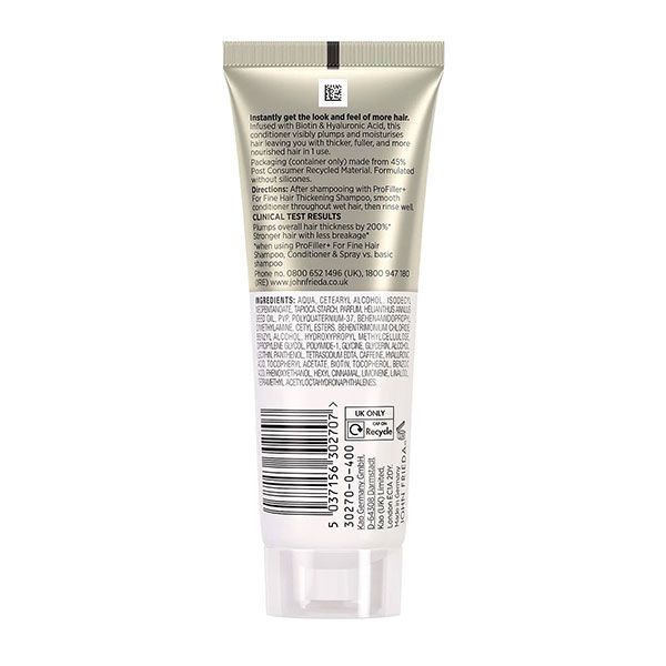 Balsamul John Frieda PROfiller+ este conceput special pentru îngrijirea părului fin, oferindu-i o structură mai rezistentă și un aspect vizibil mai dens. Formula sa avansată, îmbogățită cu Biotină și Acid Hialuronic, acționează direct asupra fibrei capilare pentru a reduce pierderea firelor de păr cauzată de rupere. Utilizarea acestui balsam contribuie la obținerea unui păr mai plin și mai puternic încă de la prima aplicare, fără a compromite lejeritatea naturală a coafurii. Produsul nu conține siliconi sau parabeni și are o compoziție vegan friendly, fiind ideal pentru persoanele care doresc volum și fortificare fără a încărca firul de păr.