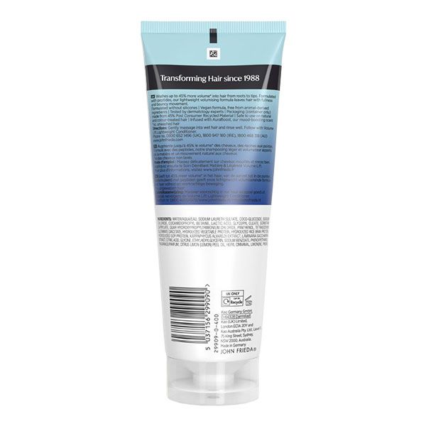Șamponul John Frieda Volume Lift este creat special pentru a oferi corp și textură părului fin și lipsit de vitalitate. Formula sa ușoară, fără silicon, curăță eficient excesul de sebum și reziduurile care pot îngreuna firul de păr, asigurând un aspect vizibil mai bogat de la rădăcină până la vârfuri. Infuzat cu peptide pentru fortificarea fibrei capilare, produsul contribuie la obținerea unui volum cu până la 45% mai mare, menținând în același timp o mișcare naturală și elasticitate. Este un produs vegan, testat dermatologic și sigur pentru utilizarea pe părul vopsit. Notele proaspete de pară și mandarină oferă o experiență senzorială revigorantă, lăsând părul curat, fortificat și plin de volum.