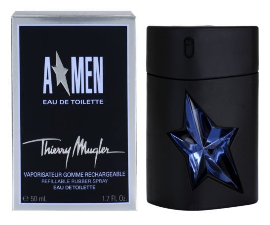 - A’men sau Angel Men a fost primul parfum pentru barbati lansat de catre Thierry Mugler, jumatatea masculina a deja cunoscutului Angel. Inspirata din imaginea eroului preferat din copilarie al creatorului, apa de toaleta se adreseaza barbatilor ce intruchipeaza curajul, puterea, masculinitatea pura. Parfumul este unic si revolutonar prin notele alese: debuteaza energic cu note piperate de menta si coriandru ce se linistesc in caldura notelor de cafea si patchouli. In inima parfumului gasim o usoara dulceata, miros de lapte cu caramel, ce se suprapune peste notele brute, pamantesti de mosc, ambra si santal, echilibrand astfel intreaga compozitie.